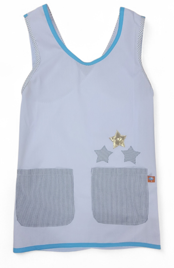 modelo espalda cruzada, confeccionado en arciel blanco y detalles de bordado 3 estrellas y bolsillos en batista estampada Messi