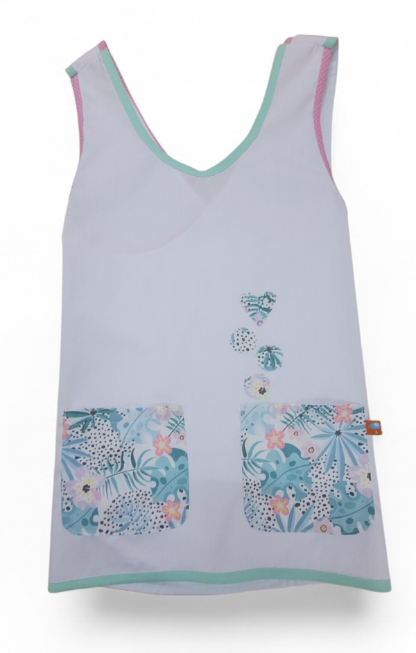 Guardapolvo modelo espalda cruzada, confeccionado en arciel blanco. Detalle de bordado y bolsillos en tela gabardina estampada exclusiva
